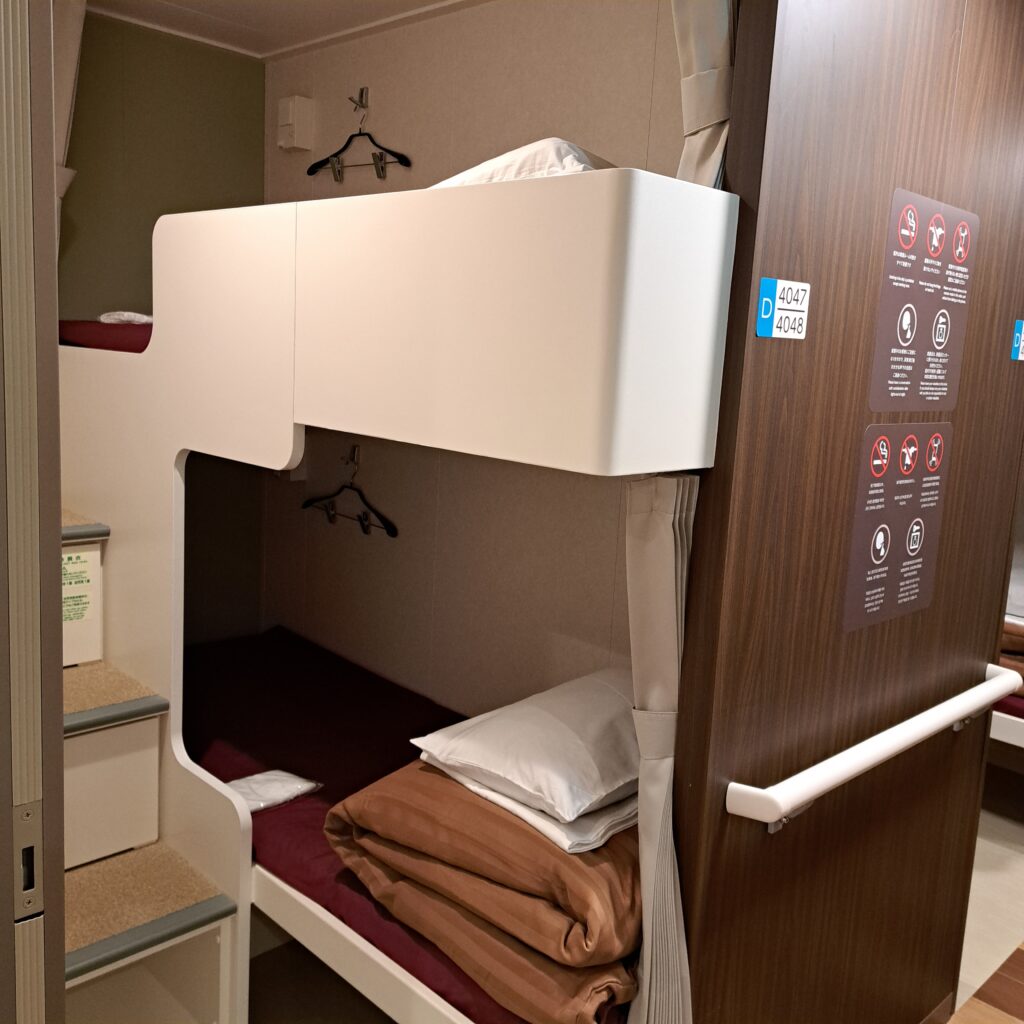 ツーリスト(広間)だと揺れる時は、立ち上がるにも一呼吸のタイミングが必要。揺れに慣れないとふらつき、近くに寝ている人を驚かせてしまう場合もあります。ツーリストよりも少しお金はかかりますが、ドミトリー以上がおすすめです。