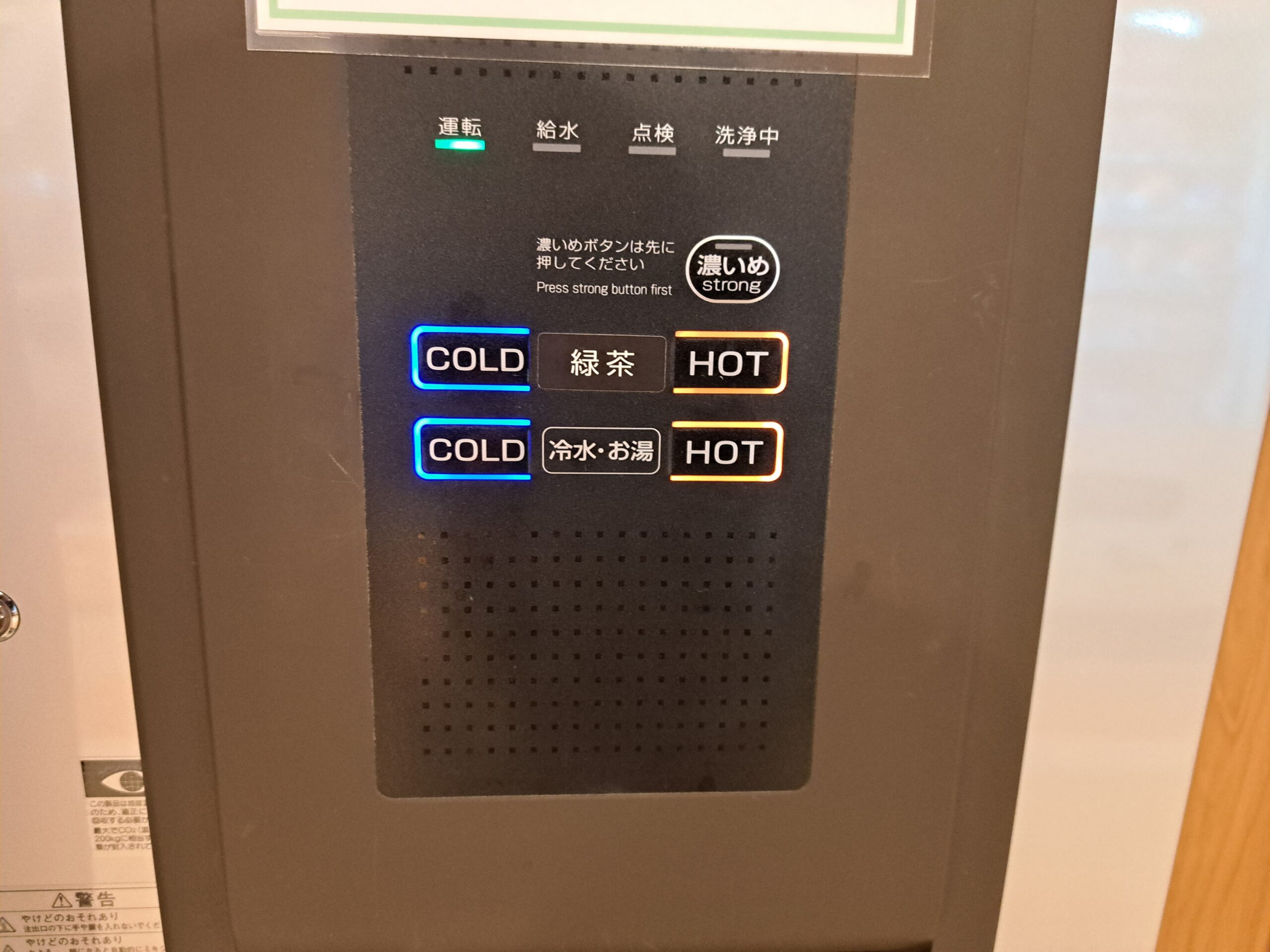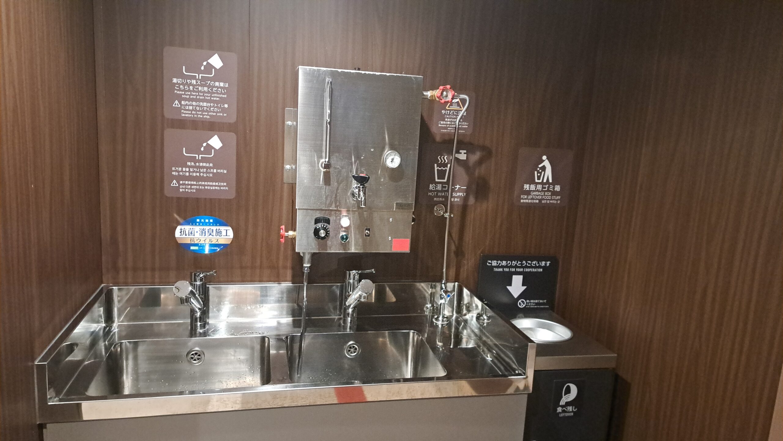 リーズナブルな食事として強い味方のカップ麺やカップ焼きそば。宮崎カーフェリーには、飲食用の給湯器があります(無料)。緑茶とお水も出ます。カップ焼きそばを作るときの、お湯を流すシンクも近くにあります(3階・4階)。