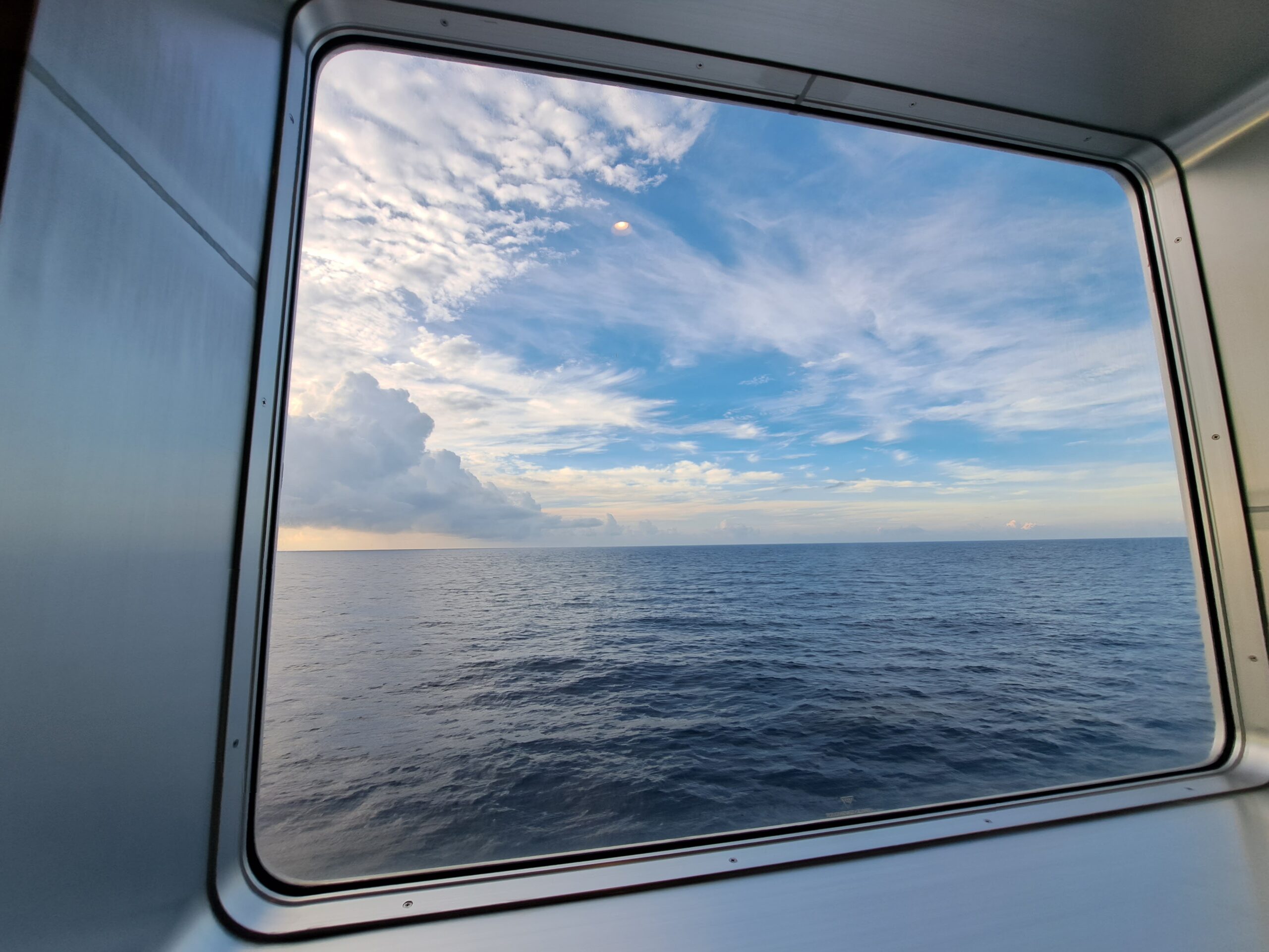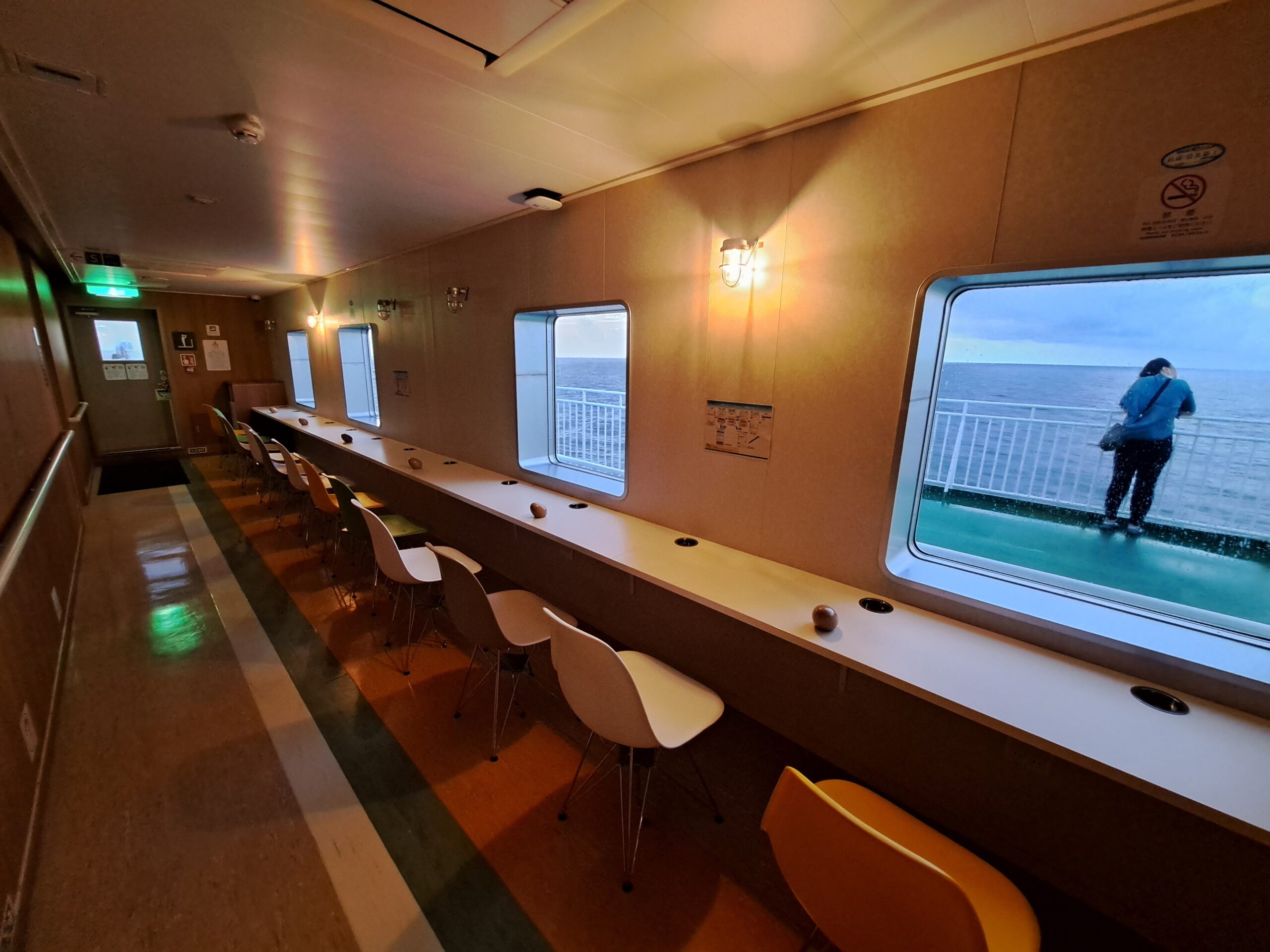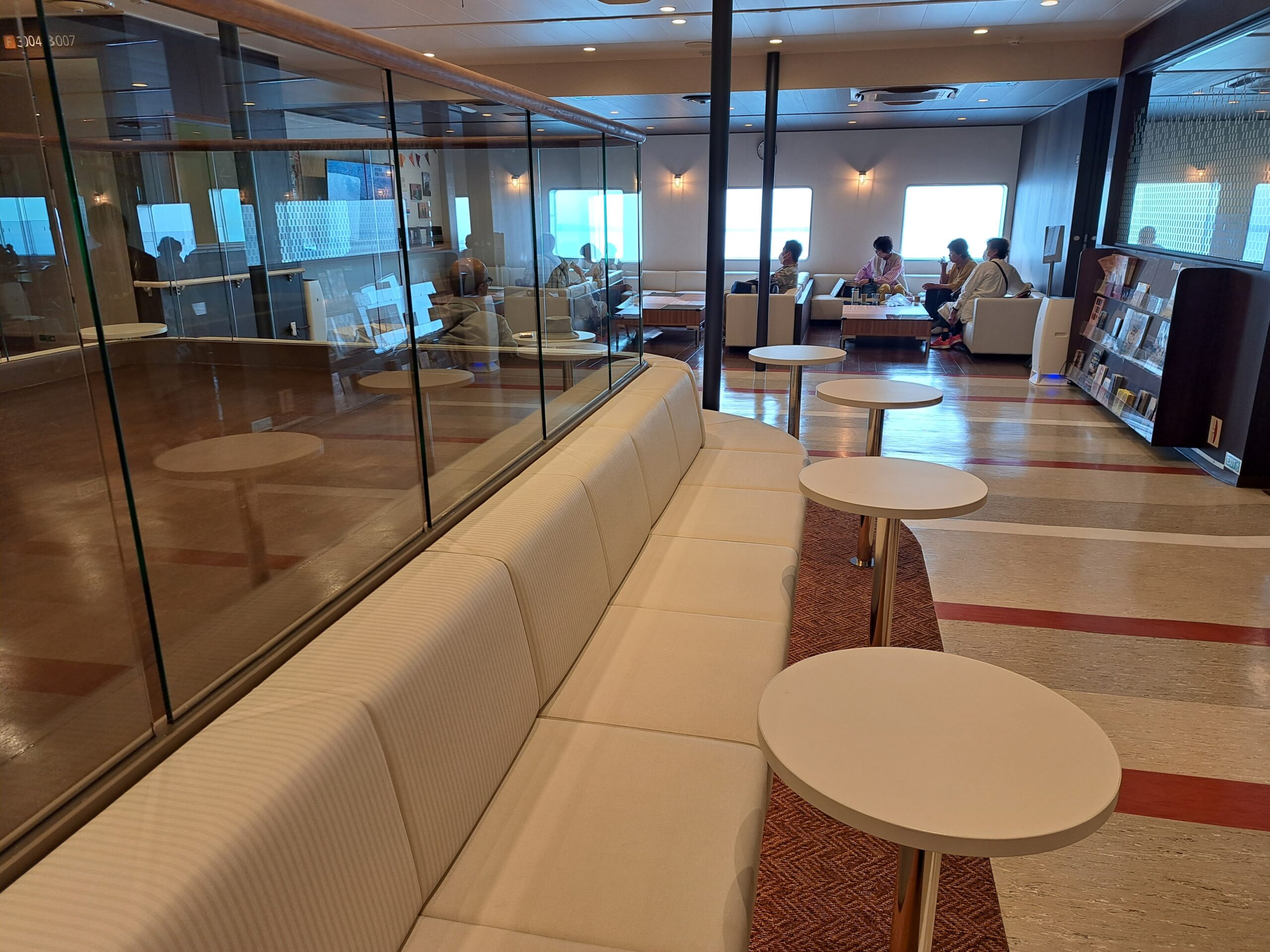 宮崎カーフェリーの新造船では船旅を楽しめるように海を見ながら持ち込みの食事を食べられる場所が増えました。